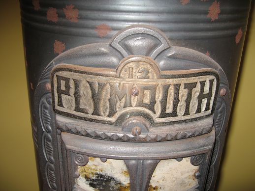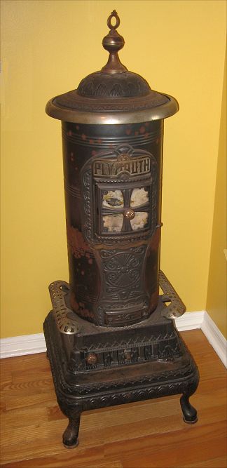 PLYMOUTH CAST IRON WOOD BURNING PARLOR STOVE: Comes apart into 2 sections, base and stove. Measures 52 1/2'' high x 19'' x 20 1/2'' overall.