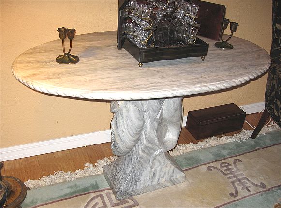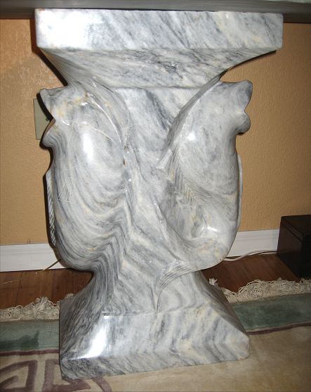 CARVED MARBLE PEDESTAL TABLE: The base being in fish form, oval top. Measures 29 3/4'' high x 48'' x 27 1/2''.