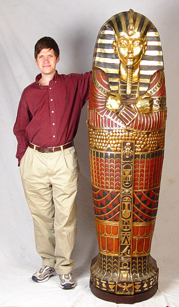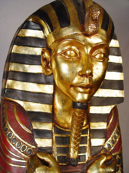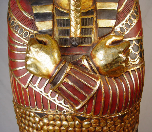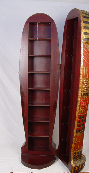 MODERN INTERPRETATION OF THE KING TUT SARCOPHAGUS CABINET: Whimsical polychromia and gilt wood cabinet. Interior shelves will hold CDs, DVDs, video games or whatever your imagination allows. Approx. 6'3'' x 19'' x 20 1/2'' wide. Est. $600/700**