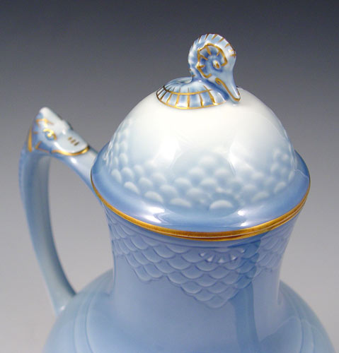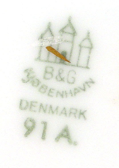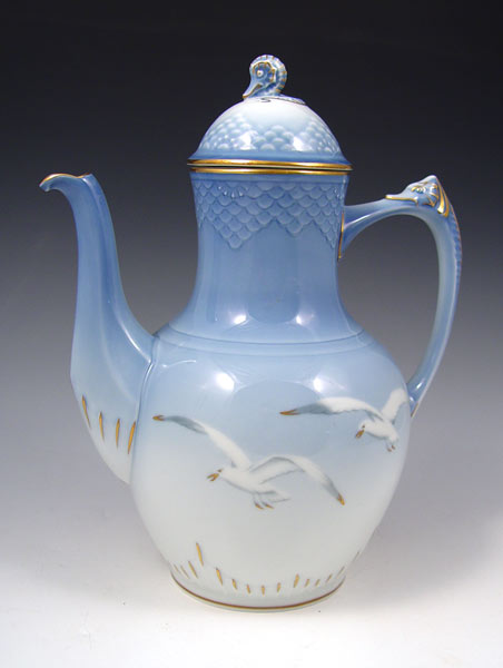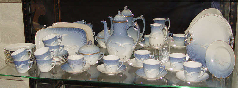 BING & GRONDAHL CHINA IN THE SEAGULL PATTERN: Dessert and coffee set to include tall coffee pot 91A, a 10'' pierced handle serving plate, a 10 3/4'' oblong plate, covered sugar, cream pitcher, 12 cups, 12 saucers, and 12 cake plates. There are gold lines through the marks on many pieces.