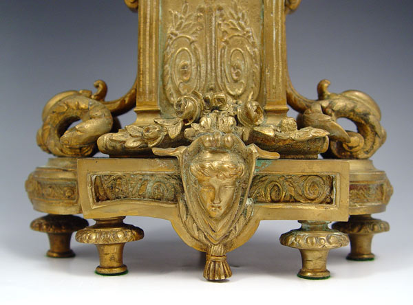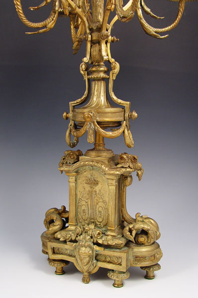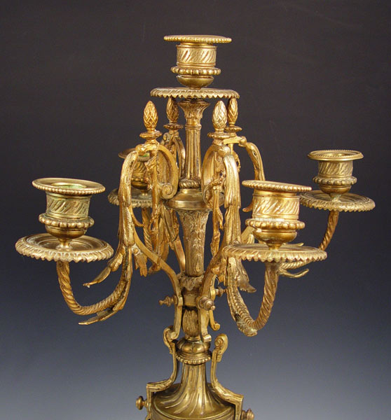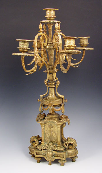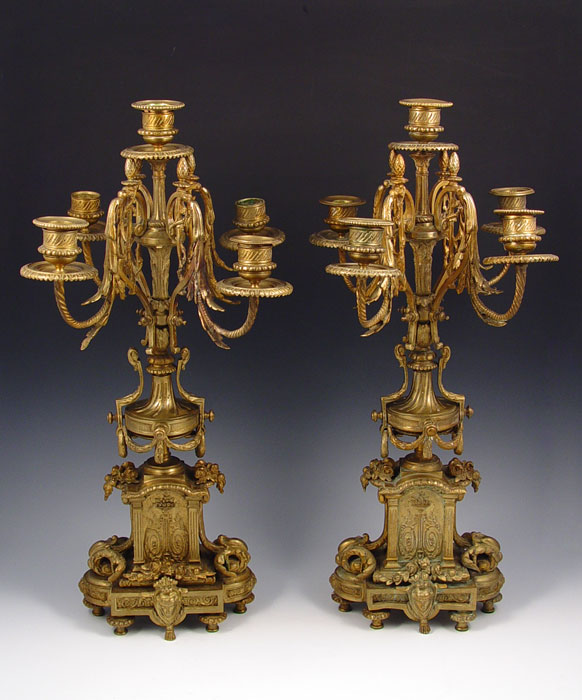 PAIR 5 LIGHT BRONZE CANDELABRA: Adorned with masqueron, garland swags, floral decoration. Measures 20'' high x 12'' top dia.