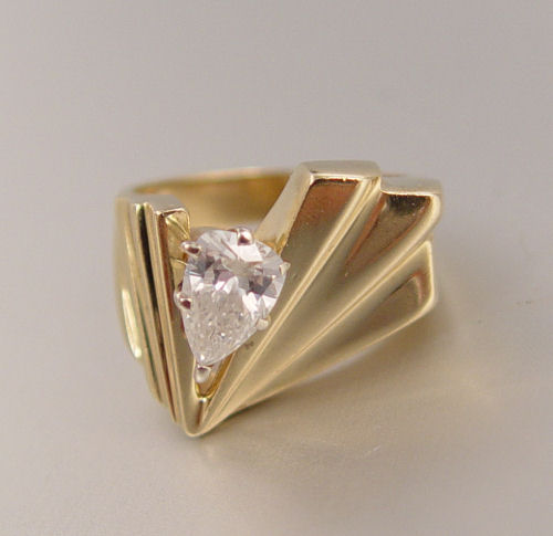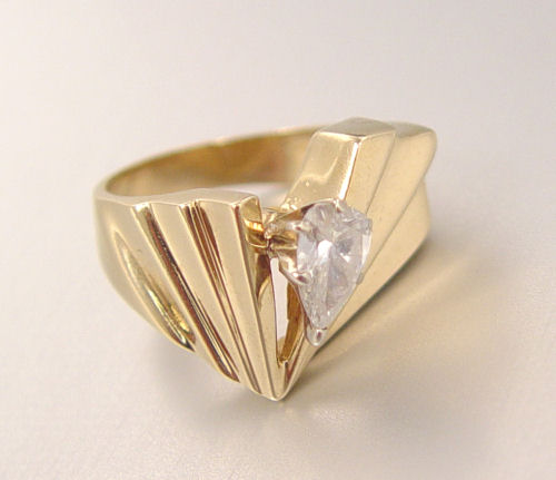 .85 CT PEAR DIAMOND FASHION RING: 14K yellow gold fashion ring contains one pear brilliant cut diamond, approx. .85 Ct. The diamond is rated SI2 in clarity and I in color. The diamond is prong set. Size 7. Weight: 7.7 grams. Est. $1250/1650**