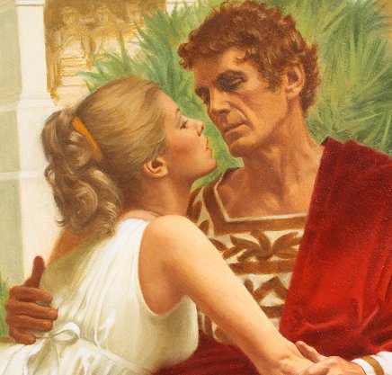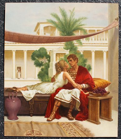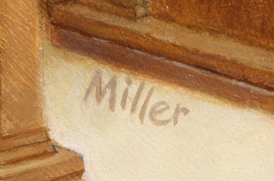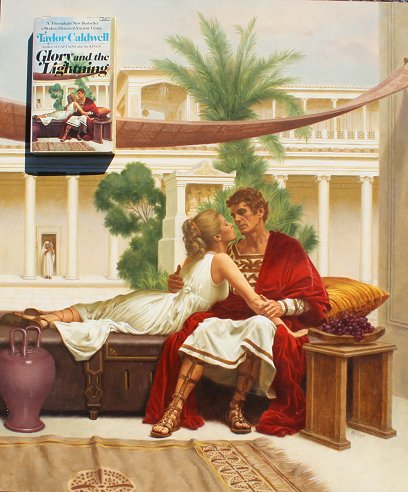 ROMANCE NOVEL COVER ART BY TOM MILLER; WITH BOOK: Oil/Masonite, 26'' x 22'', signed, unframed, sold with copy of the Taylor Caldwell paperback Glory and the Lightning.