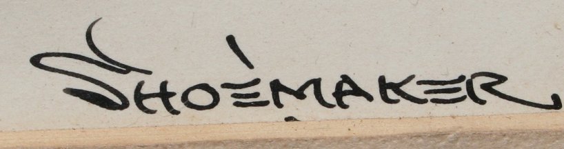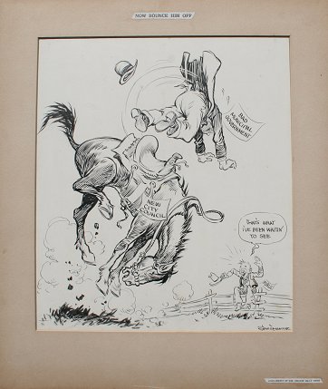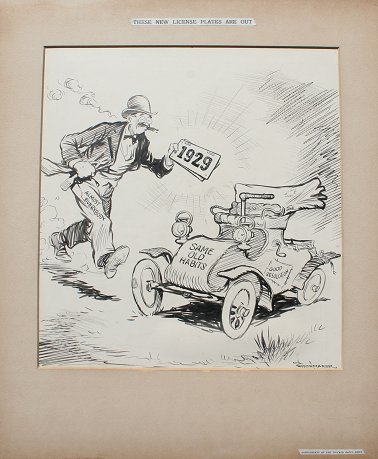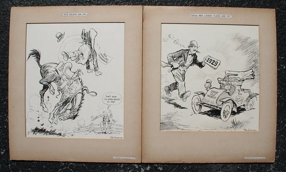 SHOEMAKER, Vaughn, (American, 1902-1999): Pair of Political Illustrations for the Chicago Daily News, ''These New License Plates are Out'' and ''Now Bouncing Off'', sight size 14'' x 13'', mounted to backboards and matted, overall 21'' x 18'', signed with acknowledgments affixed ''Compliments of the Chicago Daily News''. Est. $300/500**
