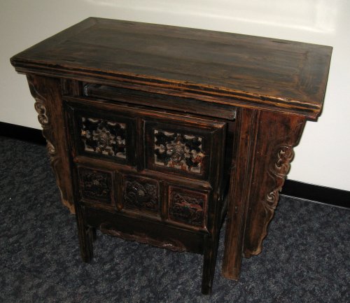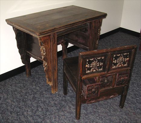 ANTIQUE CHINESE WRITING TABLE AND CHAIR: Flat top desk with adaption for use with a computer; chair, which tucks completely into front of desk, has small drawers to base of back and is on rollers, desk measures 32''h. x 42'' x 24'', chair approx. 29 1/''h. x 21 1/2'' w x 18 1/2''d.