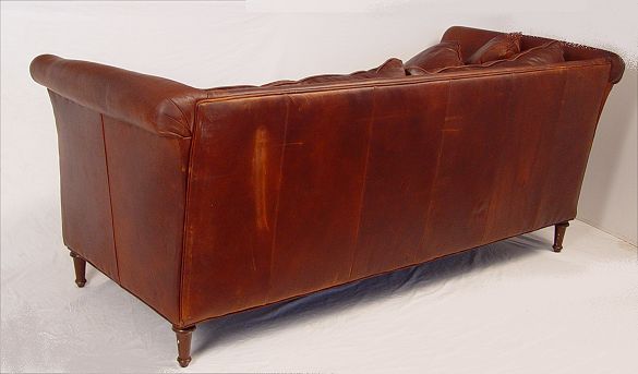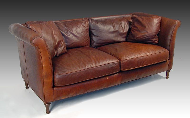 BROWN LEATHER SOFA: Contemporary leather sofa retailed by Leather Express. Two cushion back and two cushion seat, 2 throw pillows. 7 ft long x 3 ft deep x 34'' deep.