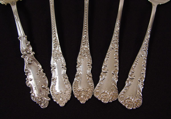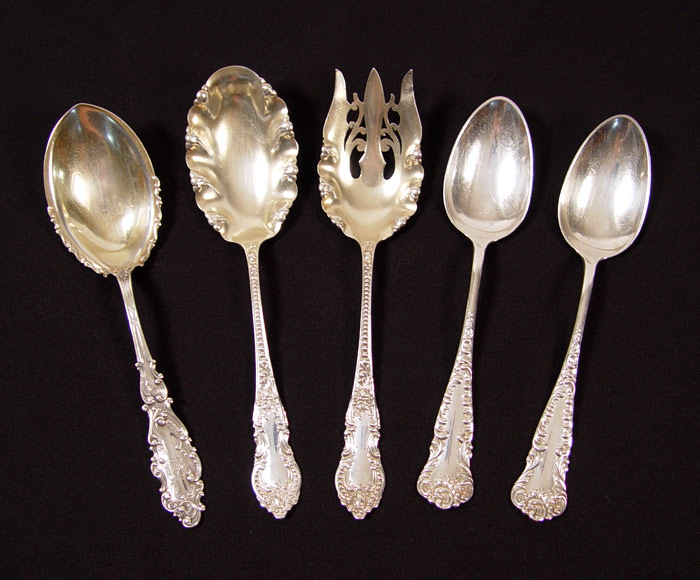 5 PIECE GORHAM AND TOWLE STERLING SERVING SPOONS: To include 2 matching Towle serving spoons, A. Stowell & Co. retailer (8 1/4''). Matching Towle serving spoon (9'') and pierced vegetable server (9''), A Stowell & Co. retailer. Gorham preserve spoon (8 1/2'', monogrammed) in the Luxembourg pattern. Approx 11.3 troy oz.