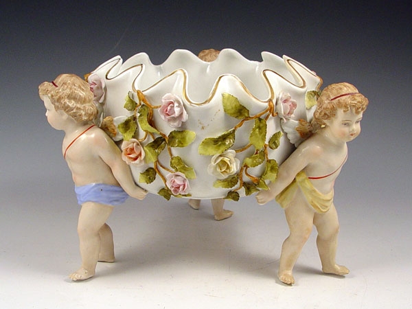A. LAMM DRESDEN GERMAN PORCELAIN CENTER PIECE: Ca. 1887-1949. Applied rose laden vines on a ruffle rim bowl supported by three figures of Cupid. Bowl is 7'' dia. excluding Cupid. 7''h. Bears the Dresden mark of Ambrosius Lamm.