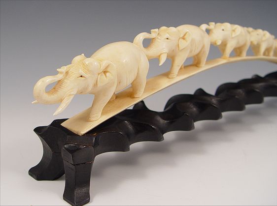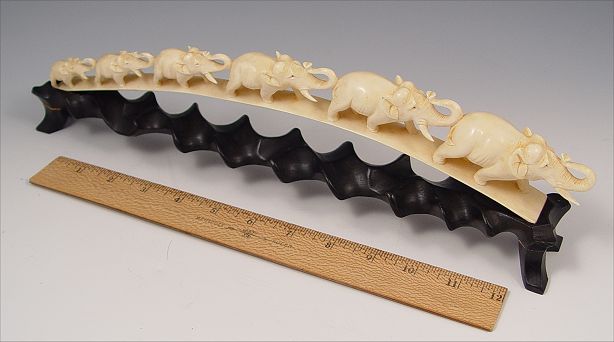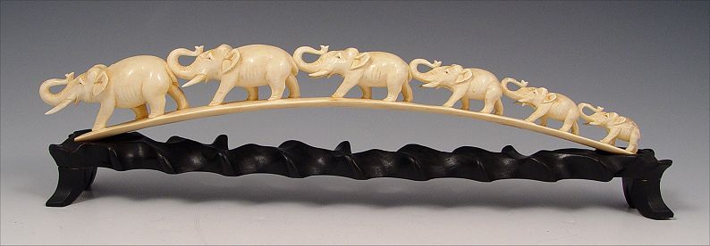CARVED IVORY ELEPHANT BRIDGE: 6 elephants. The ivory is 14'' long. Rests on a wood base.