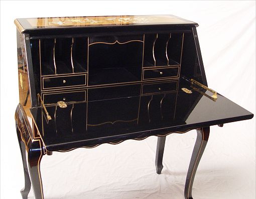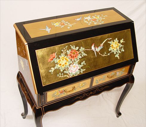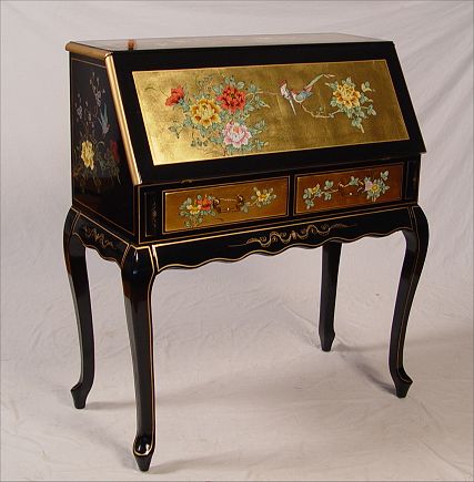 CHINESE BLACK & GOLD LACQUER DROP FRONT DESK: Measures 42 1/4'' high x 36'' x 18''