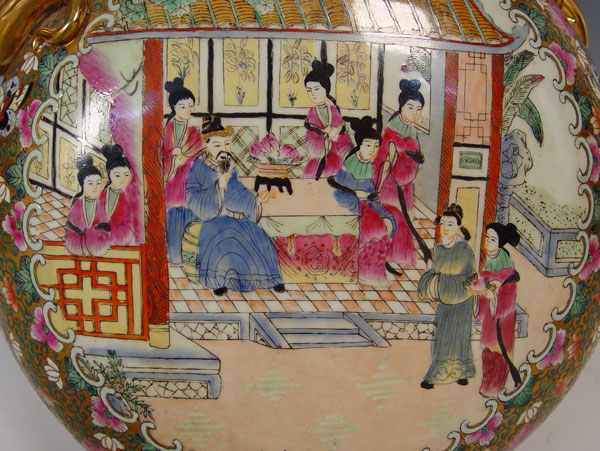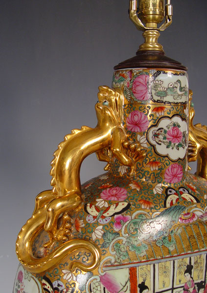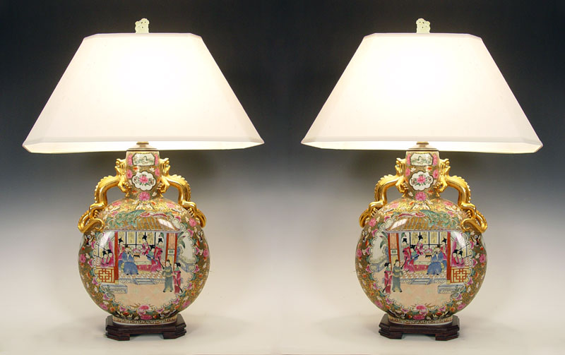 PAIR OVERSIZE ROSE MEDALLION CHINESE CERAMIC DISC VASES: Mounted as lamps, featuring gilt dragon handles, carved jade finial. Sold with the elongated octagonal shades. Lamps are 36''h. overall including wood base and finial, ceramic is 15'' dia.