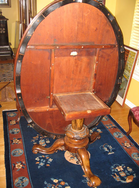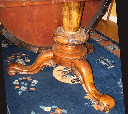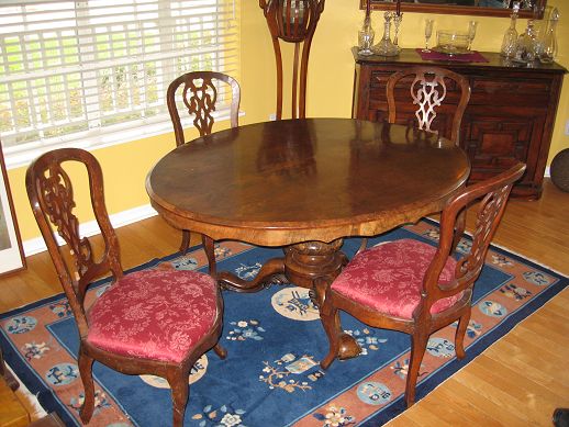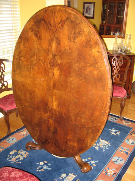 19th C BURL WALNUT LOO TABLE AND 4 CHAIRS: Tilt top table with carved pedestal and legs, measures 29 1/4'' high x 59'' x 44''. Serpentine front, pierced back side chairs measures 36 1/2'' high x 20 1/2'' x 22'', note wormholes in chairs, repair to leg.