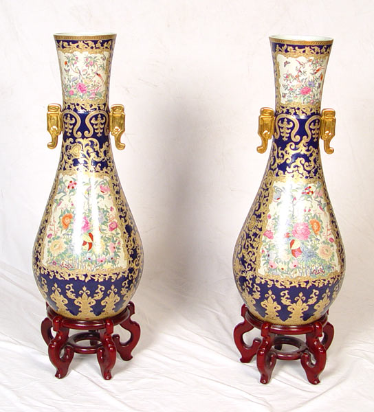 PAIR DECORATIVE CHINESE POLYCHROME FLOOR VASES: Vases measures 31 1/2'' high x 13'' dia. Wood bases measures 7 1/2'' high x 11 1/2'' dia.