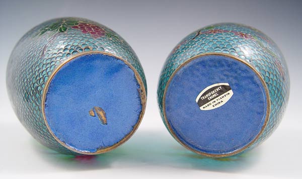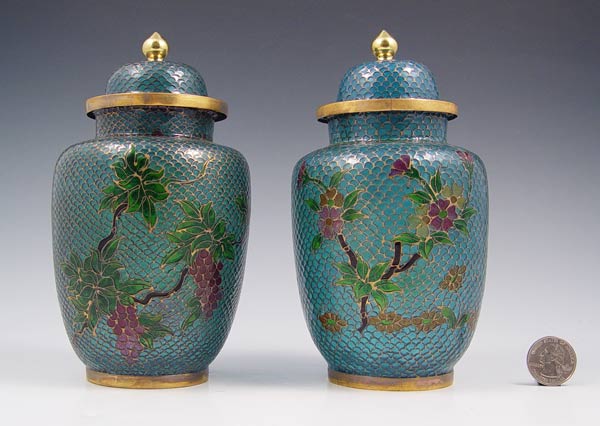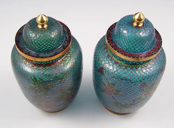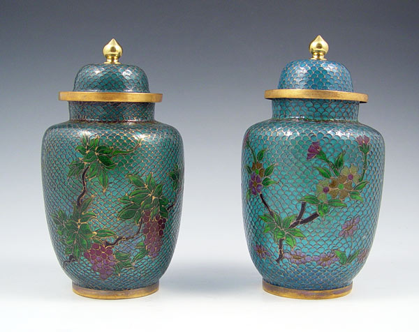 PAIR LATER CHINESE PLIQUE A JOUR COVERED JARS: 6 1/2'' tall.
