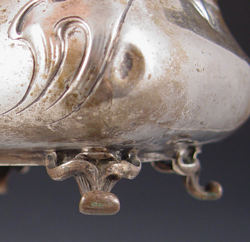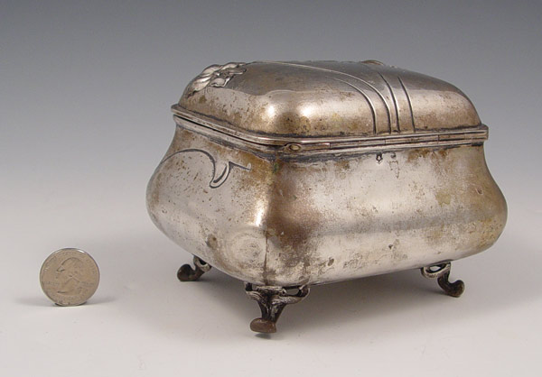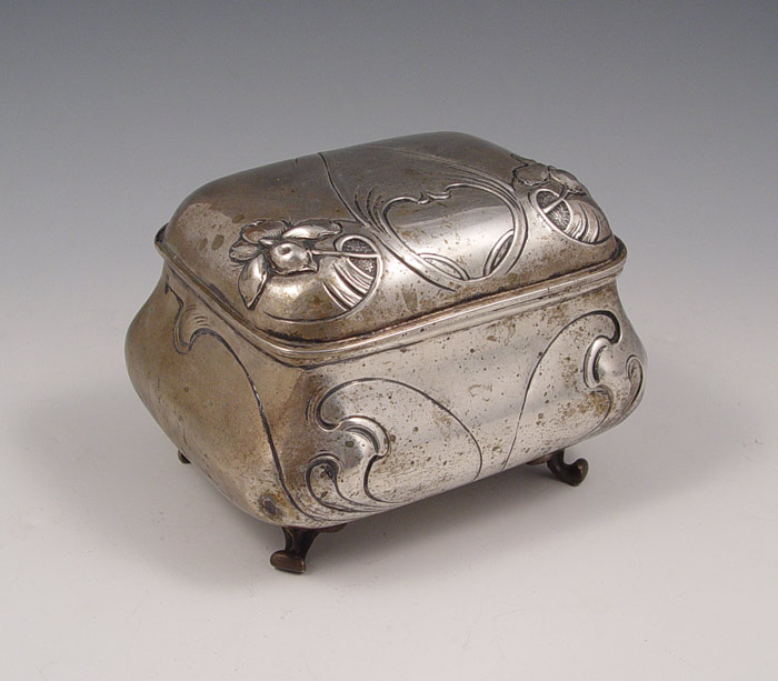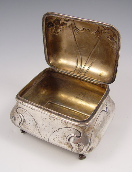 OTTO WAGNER AUSTRIAN SILVER ART NOUVEAU BOX: Hallmarked with Austrian hallmark and makers initial VCD, Vincenz Carl Dub 1886-1924. Repousse floral design with art nouveau styling on 4 feet and hinged lid. Measures 3 7/8'' high x 5'' x 4''. Approx. 10.4 troy oz. From the direct descendants and collection of Otto Wagner, noted German architect