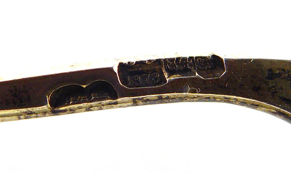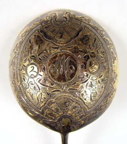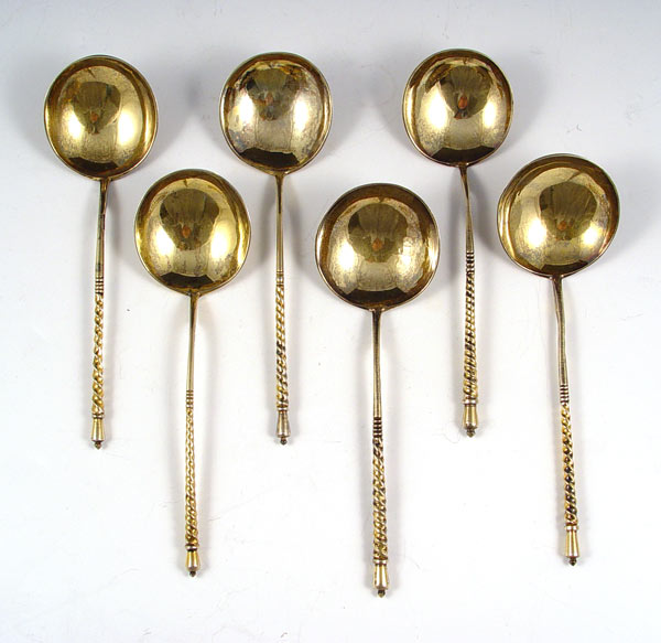 19TH CENTURY MOSCOW RUSSIAN NIELLO SILVER SPOONS: 6 pieces hallmarked with Maxim Ivanov, Moscow silversmith 1874-1890. Hand engraved design with monogram on reverse side of bowls, twist handles. 84 zolotnik mark. Measures 6 3/4'' long, note wear to niello overlay on spoons. Approx 7.4 troy oz. Est. $700/1000**
