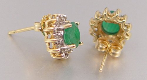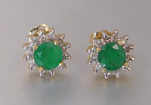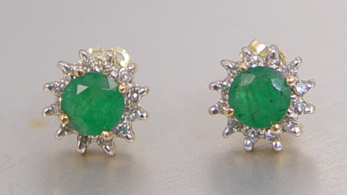 14K EMERALD & DIAMOND EARRINGS: 14K white gold earrings contain 2 round mixed cut emeralds, approx. 1 Ct. The emeralds average I1 in clarity (Type III), G in Hue, 3-4 in Tone and 2-3 saturation. 24 round full cut diamonds, approx. .20 Ct., average I1 in clarity and H-I color. The emeralds and diamonds are prong set. Post and nut closures. Weight 2 grams.