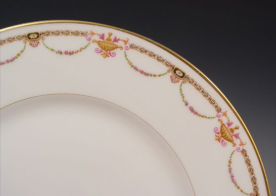 FRENCH LIMOGES CHINA SERVICE: Bernardaud & Co, Ca. 1900-1914. Approx. 87 pieces to include 2 platters (15 1/2'' and 11 1/4''), 2 covered vegetable, 1 open vegetable, relish dish, gravy, creamer and sugar. There are also 11 dinner plates (9 3/4''), 12 salad, 12 soup bowls, 10 bread plates, 12 dessert bowls, 9 cups and 12 saucers.
