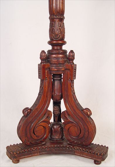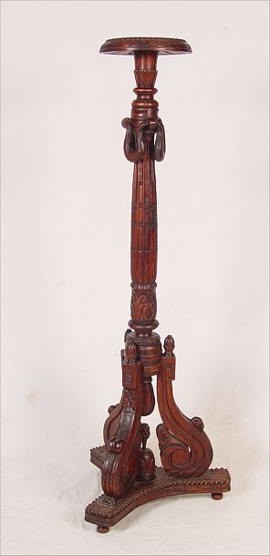 EXTRA TALL CARVED MAHOGANY FERN STAND: Nicely carved Victorian style pedestal. 57 1/2'' high x 19'' base dia., the circular top is 8'' across.
