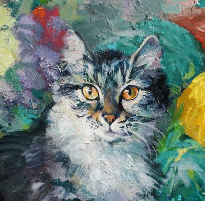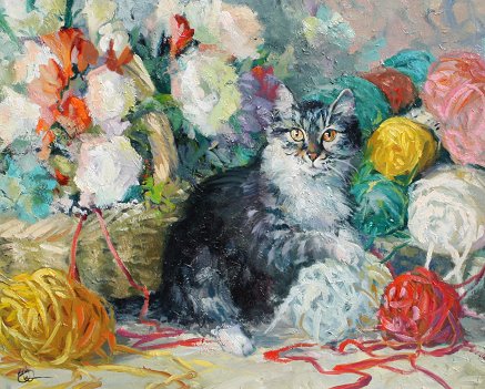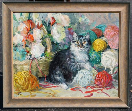 PENDLETON, Elin, (American, 20th C): Cat with balls of yarn and flowers, OIL/Canvas, 24'' x 30'', monogrammed lower left, encased in custom painted frame, 29'' x 35''. Est. $1500/2500**