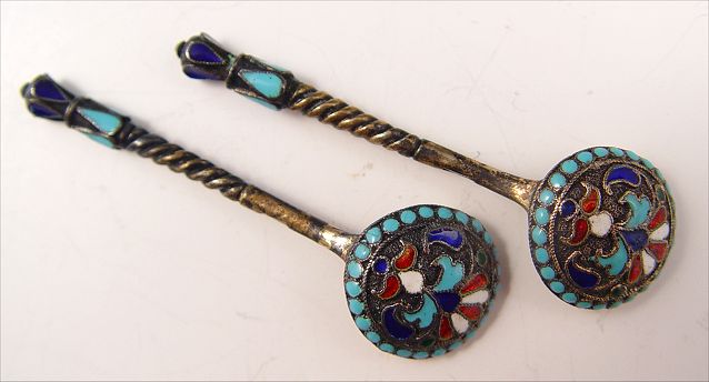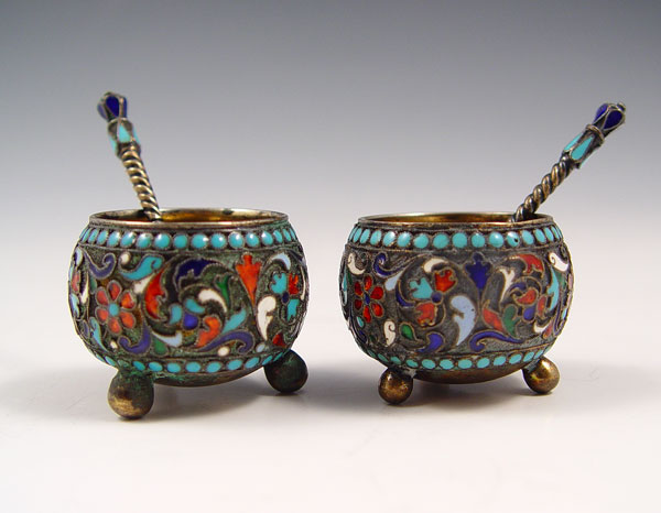 PAIR RUSSIAN ENAMEL SILVER SALTS WITH SPOONS: Circa early 20th century. Unknown town and maker 84 zolotnik hallmark. Floral enamel pattern with swirls, 3 feet. Salts measure 1 1/8'' high x 1 3/8'' dia. Spoons measure 2 3/8'' long.
