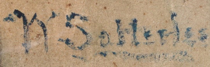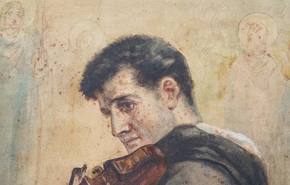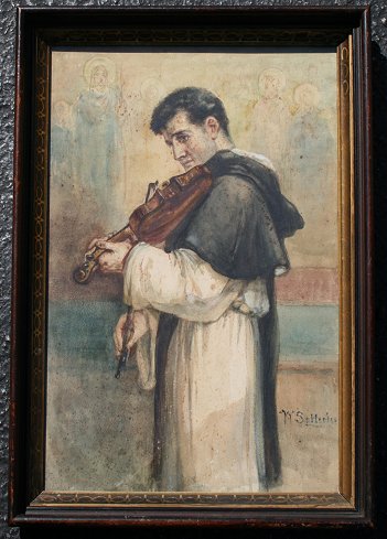SATTERLEE, Walter, A.N.A., (American, 1844-1908): Friar or Priest playing a violin in church with religious freeze in background, Watercolor, 20'' x 14'', signed, painted wooden frame with wear, 23'' x 16 1/2''. Est. $200/400**