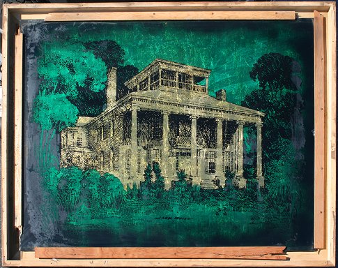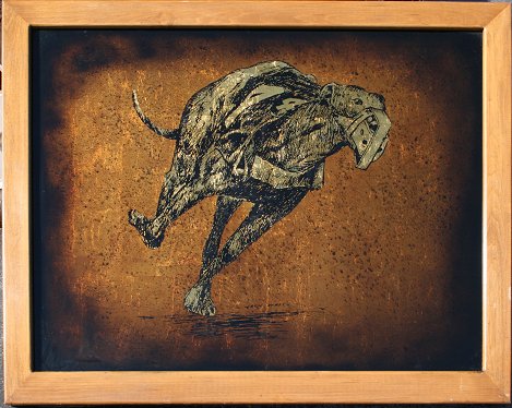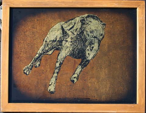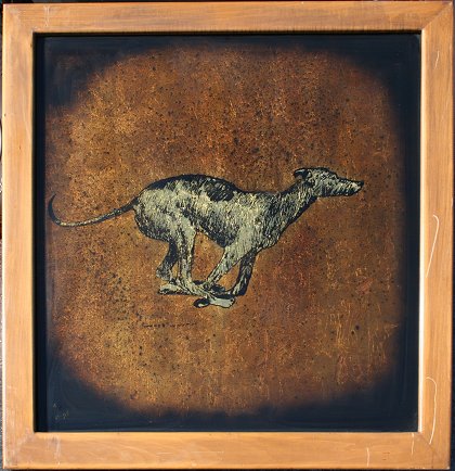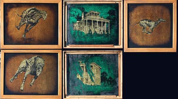 WHITE, Jack, (American, 20th C): 5 Special mixed media techniques called Echruseos form this lot. 3 plates are of greyhounds racing, and 2 are of stately Southern Plantations, two with sight size approx. 34 5/8'' x 47'' and one greyhound measures 35'' x 35'', all are signed. 2 larger are backed in the same frame, dog to mansion, with a total of 3 wooden frames, some abrasions and wear on frames, overall two at 40 1/2'' x 53 1/8'' and one at 41'' x 41''. Est. $800/1200**