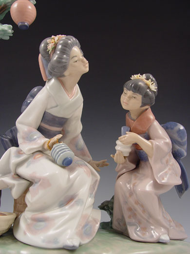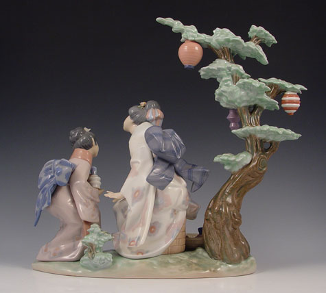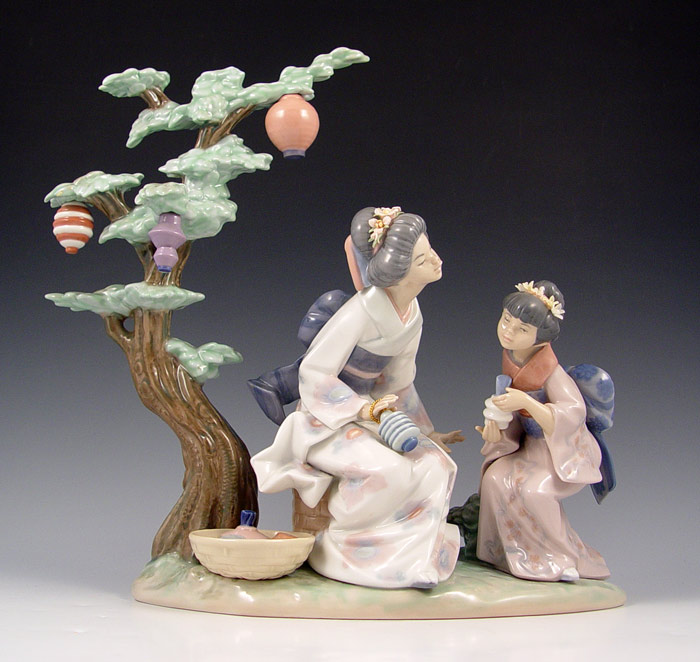 LLADRO PORCELAIN GROUP ''A MOTHERS WAY'' #5946: 11 1/4'' tall. Retired in 1996. Japonesa Adornando Arbol.