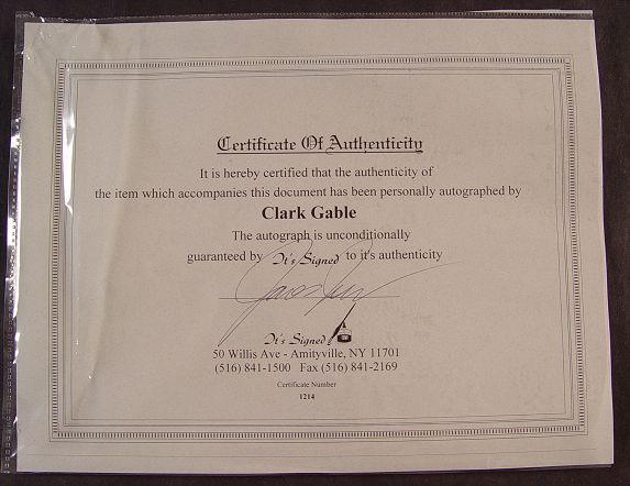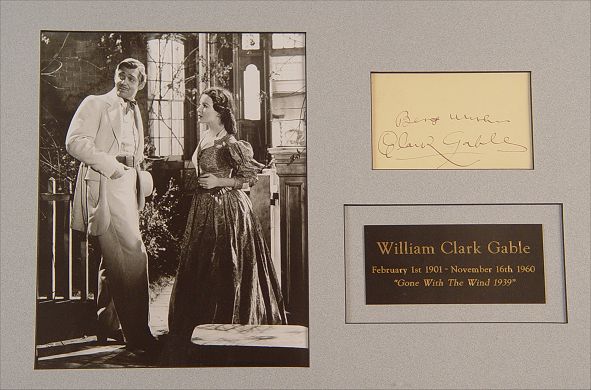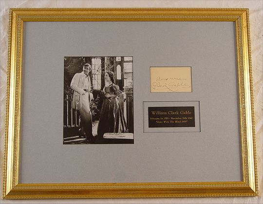 CLARK GABLE PHOTO & AUTOGRAPH: Framed with photo of Clark Gable from ''Gone with the Wind'' and clip signature ''Best Wishes Clark Gable''. Comes with Certificate of Authenticity from TT's signed, Amityville NY. Frame measures 21'' x 26 3/4''