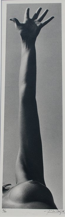 CLERGUE, Lucien, (French, 1934-): Nude with outstretched arm, Black and White Photograph, sight size 21 1/2'' x 7'', signed lower right, numbered lower left 16/50, chrome metal frame, 28'' x 21 1/2''. Est. $500/800**
