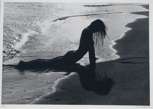 CLERGUE, Lucien, (French, 1934-): Female Nude Silhouette on the beach, Black and White Photograph, sight size 15 1/2'' x 21 3/4'', signed lower right, numbered 21/50 lower left, chrome metal frame, 22'' x 28''. Est. $500/800**