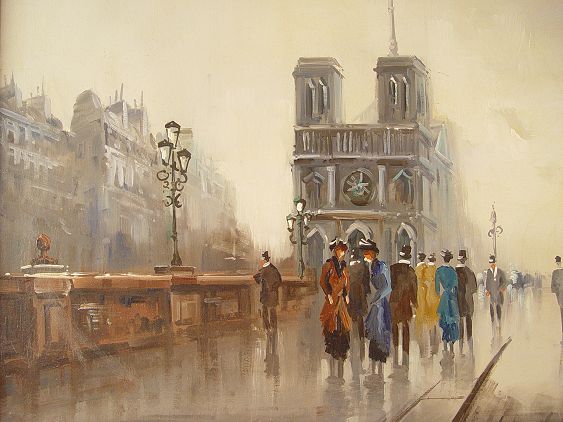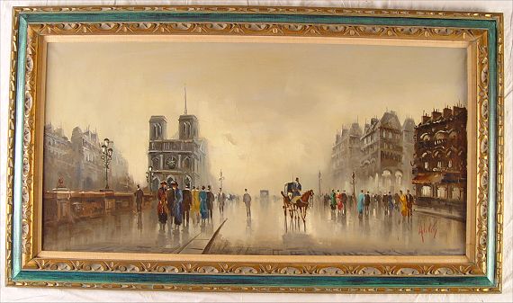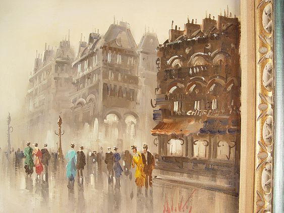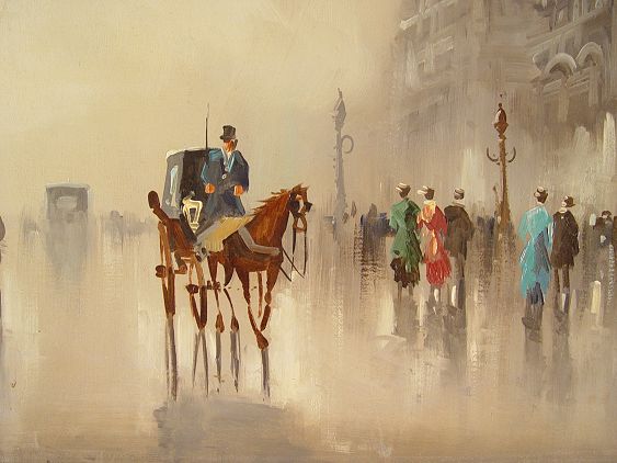DEVITY, Antonio, (Italian, 1901-1993): Parisian street scene with carriage, OIL/Canvas, 24'' x 48'', signed lower right, studio label verso, framed 32'' x 56''.
