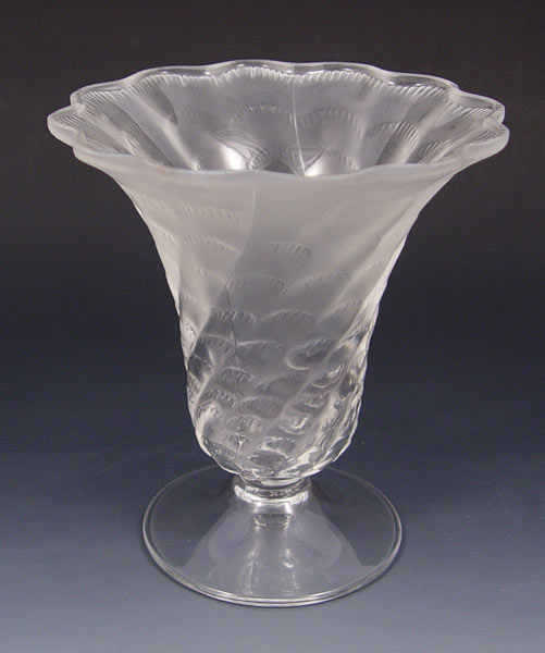 LALIQUE CRYSTAL VASE: Flared rim vase fades from frosted to clear crystal, signed, 5 1/4''.