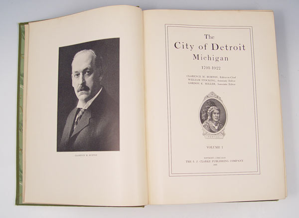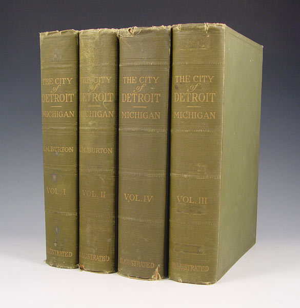 4 VOLUMES 1922 THE CITY OF DETROIT HISTORY: 4 volume set titled ''The City of Detroit'' by Clarence M Burton, published by S. J. Clarke Publishing Company, 1922. Largest book measures 2 3/8'' high x 11'' x 8 1/4''. Note spine wear.