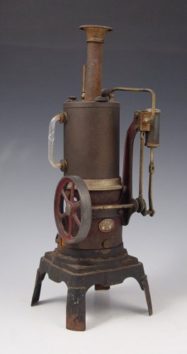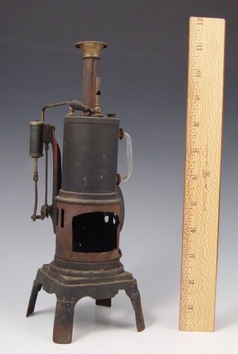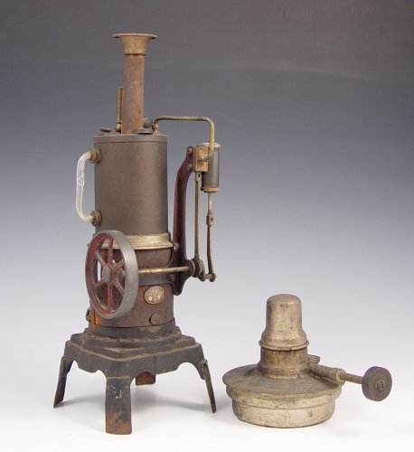 GERMAN ERNEST PLANK VERTICAL STEAM ENGINE: Marked with EP plaque, comes with Sternau & Co burner, does not fit correctly. Engine measures 11'' high x 4'' x 4''.