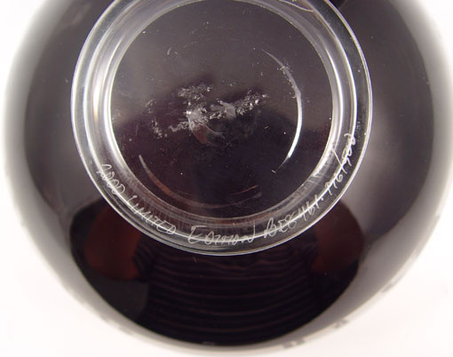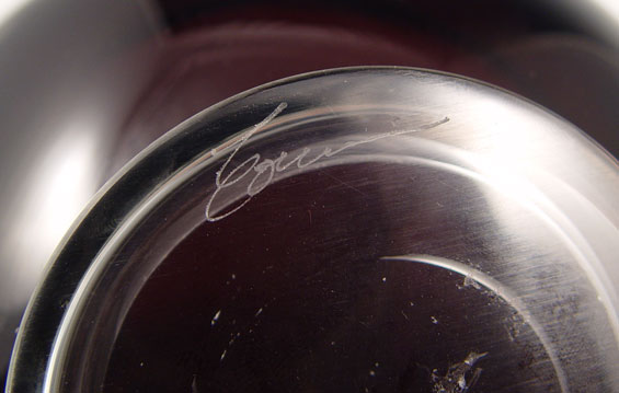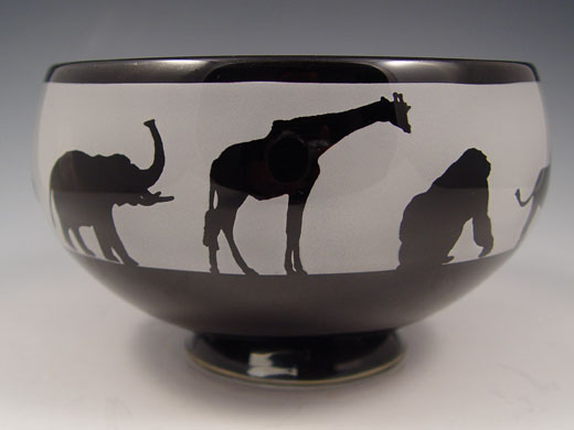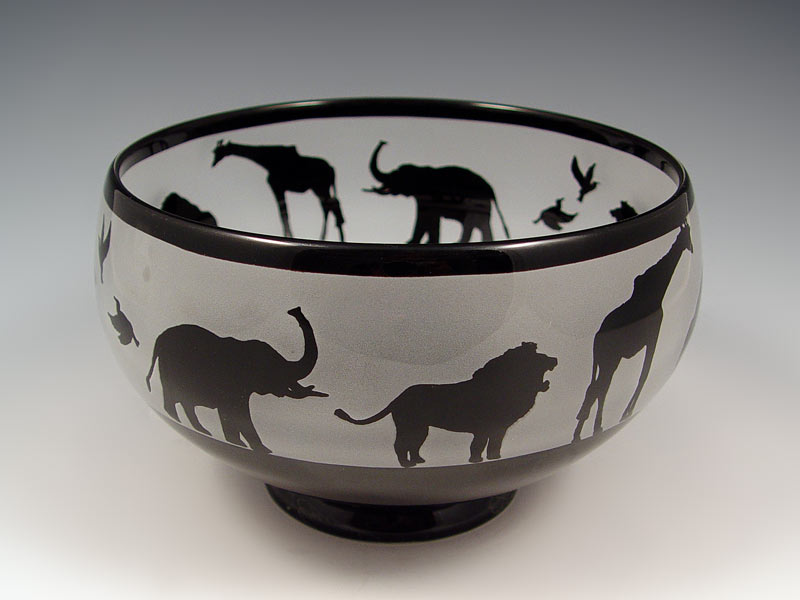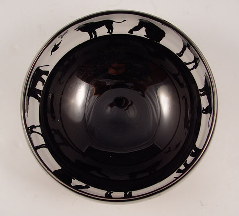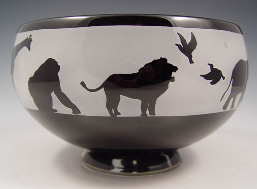 SIGNED ART GLASS BOWL IN AFRICAN ANIMAL MOTIF: Limited edition of 2000. Illegibly signed. Deepest amethyst glass, interior cut to frosted in a frieze of African animals. 7'' dia., 4 1/2''h.