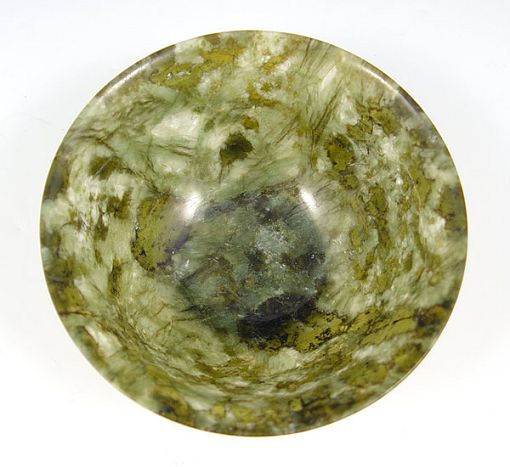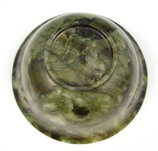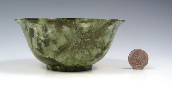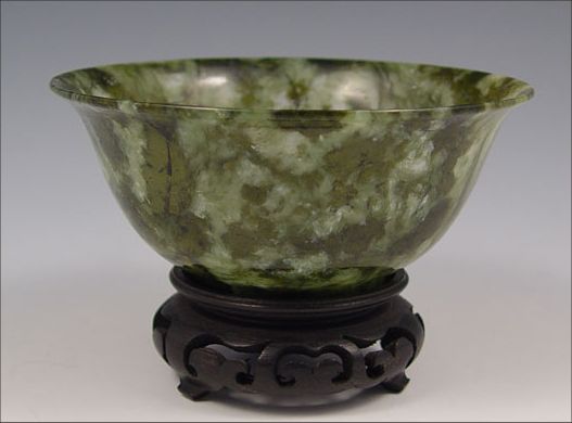 CHINESE SPINACH JADE BOWL: 2 1/4''h. x 5'' dia. Sold with the carved wood stand.