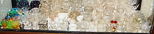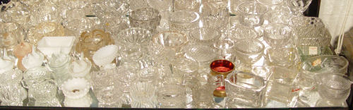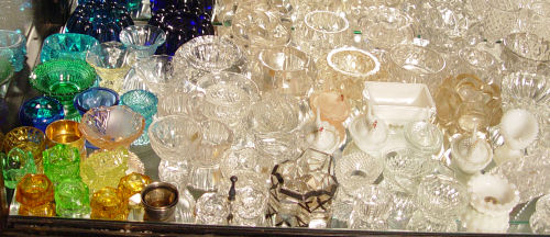 ESTATE COLLECTION OF GLASS SALTS: Approx. 100 salts to include Cambridge Elegant Glass, Hens on Nests, glass of all colors including yellow, blue, cranberry, milk glass and more. Sold as a lot.