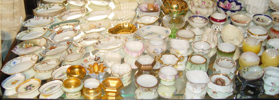 MORE OF THE ESTATE COLLECTION OF SALTS: These are mostly porcelain, including Nippon, Noritake, Limoges, Austrian, James Kent, Prussia, and Rudalstadt.