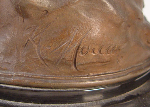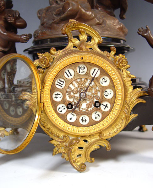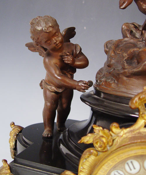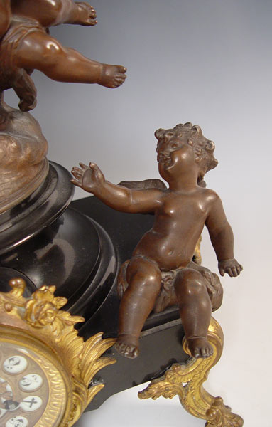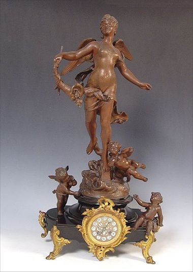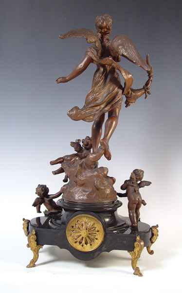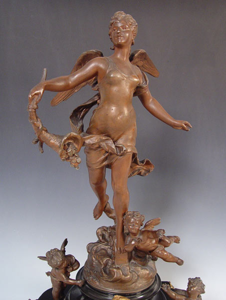 VINCENT D' ARGENT FIGURAL MAIDEN & CHERUBS CLOCK: Auguste Moreau bronzed metal figural maiden with cherubs sculpture signed at base. Marked with Vincent D' Argent Paris on key & pendulum mechanism. Measures 31 1/2''h Est. $1000/1500**