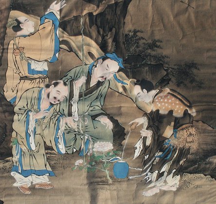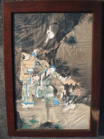 LARGE ORIENTAL GENRE PAINTING: Figures, with white monkey, Watercolor/Gouache, 37 1/2'' x 25'', 1/4 sawn oak frame with wear, 43'' x 30 1/2''.