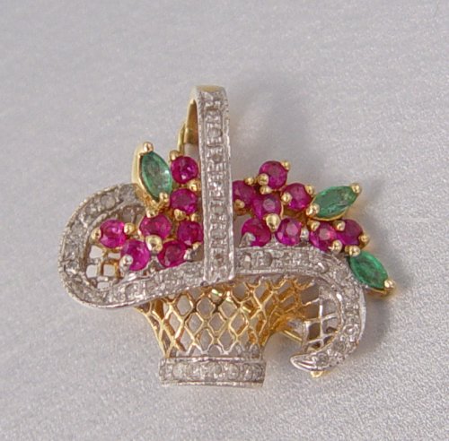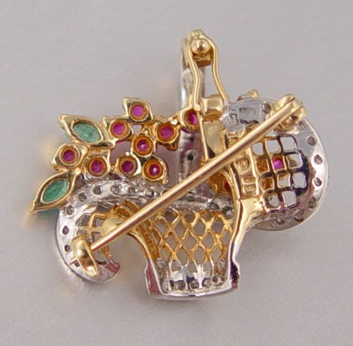 DIAMOND, RUBY AND EMERALD BASKET PIN / ENHANCER: 14K yellow and white gold pin pendant in the form of a stylized basket with 38 round single cut diamonds, approx. .20 Ctw., averaging SI in clarity and I-J in color. Also 15 round mixed cut rubies as the flowers and 3 marquise shaped mixed cut emeralds as the leaves, approx .75 Ctw. The diamonds and gemstones are prong set. Bar pin and figure eight bail. 3/4'' length. 3.5 grams.