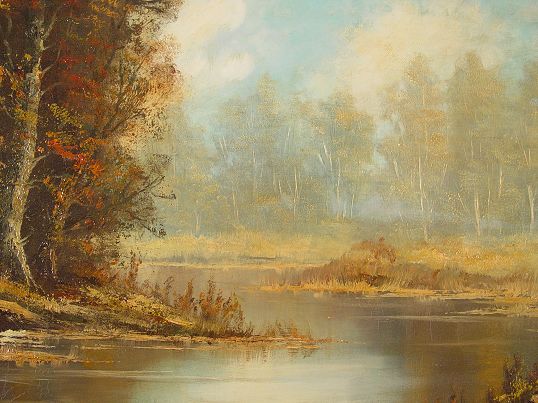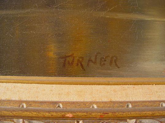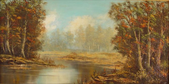 STREAM LANDSCAPE OIL/C SIGNED TURNER: Serene landscape of a stream in the woods, OIL/Canvas, 24'' x 49 1/2'', signed Turner lower right, framed 21 1/2'' x 55 1/2''.