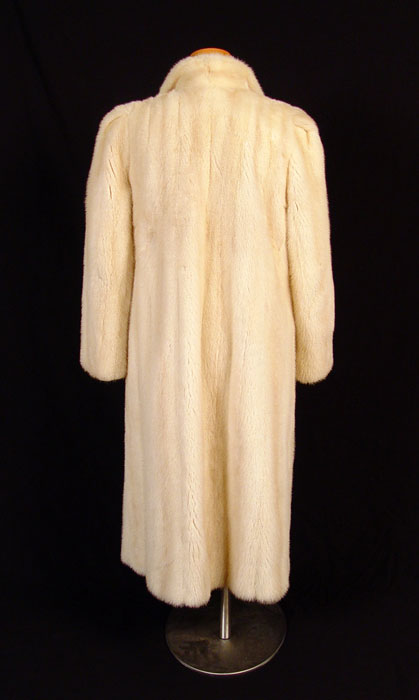 FULL LENGTH BLONDE OR WHITE MINK COAT: Full length with long sleeves, and collar. Approx. 45'' long, 18'' shoulder to shoulder.