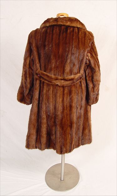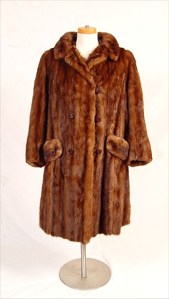 BROWN MINK COAT WITH LARGE RHINESTONE BUTTONS: Car to full length coat. Approx. 40''l, 21'' sleeve, 17'' shoulder to shoulder.