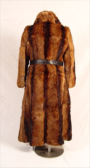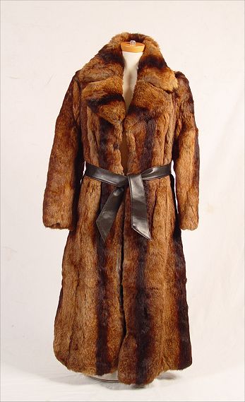 FULL LENGTH NATURAL RABBIT FUR COAT: Shades of brown rabbit fur with brown leather belt. The label says medium, measurements are approx. 48'' long, 17'' shoulder to shoulder and 23'' sleeve.