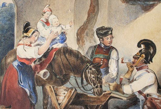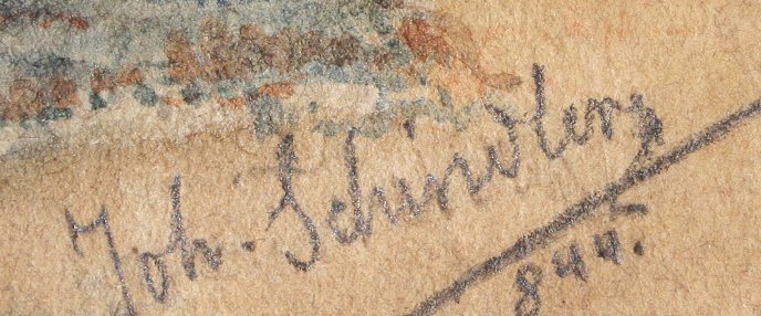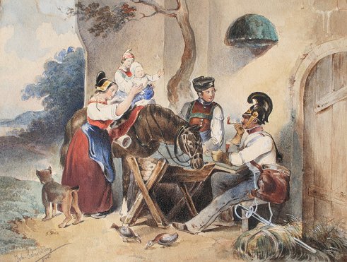 19TH C. PAINTING SIGNED JOHANN SCHINDLER: ''A Rest for the Messenger'', Water Color, sight size 7 1/2'' x 10'', signed lower left Joh. Schindler, dated 1844, gilded gesso frame with some gesso loss, 12'' x 16''. Est. $400/600**