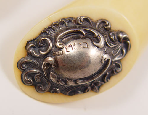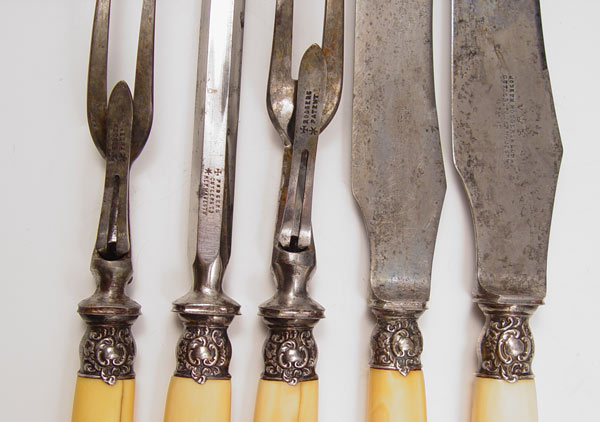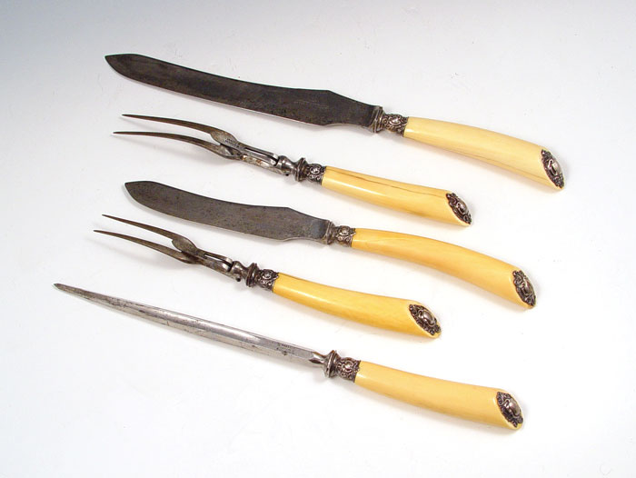 5 PIECE SHEFFIELD IVORY HANDLE MEAT CUTLERY SET: Hallmarked 1899 Sheffield and makers initials GHB (possible Harrison Brothers and Howson) on collar and ornate finial. Blades and forks marked with Joseph Rogers Cutlers to Her Majesty. Ivory handles, note minor hairlines. Largest knife measures 15 1/4'' long.