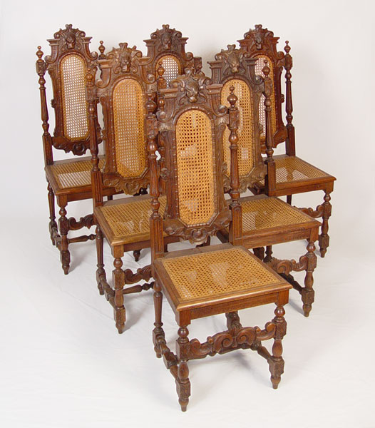 SET OF 6 RENAISSANCE REVIVAL CARVED LION'S HEAD CHAIRS: Caned back and seats. Measures 46 3/8'' high x 17 1/2'' x 16''