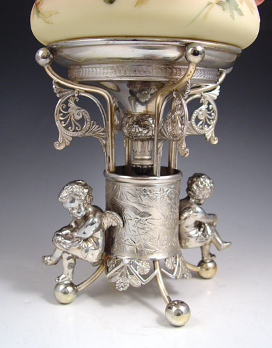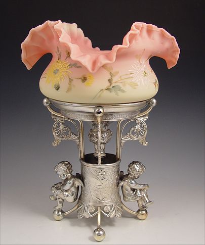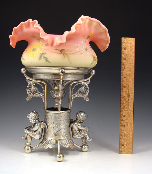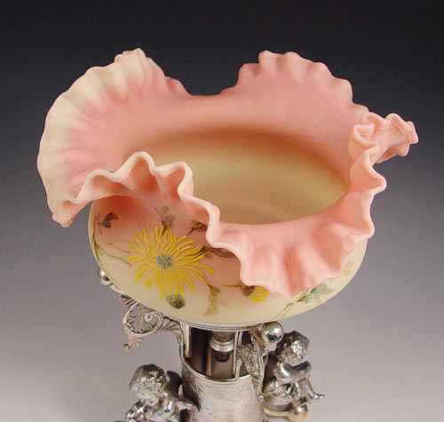 MT. WASHINGTON BURMESE BRIDES BOWL IN PAIRPOINT FIGURAL STAND: Enamel decorated Victorian art glass resting in the Pairpoint cherub figural stand #2147. The stand bears the Pairpoint logo 14'' h. overall, the stand is 9''h., the bowl is 10'' dia. Est. $3250/4000**